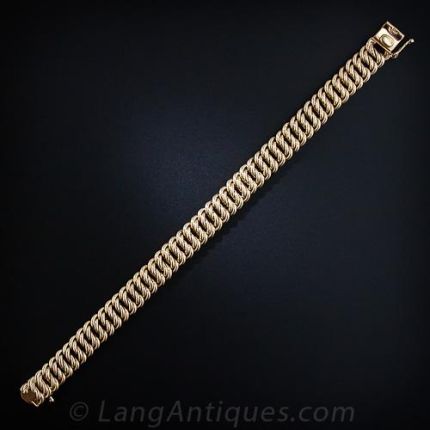 A weighty 14K Yellow gold double curb link necklace and matching bracelet with the feel of smooth, fluid gold. The necklace measures fifteen-inches long and the bracelet measures seven-inches long and both have a concealed box clasp and hinged safety. Perfect for many occasions.