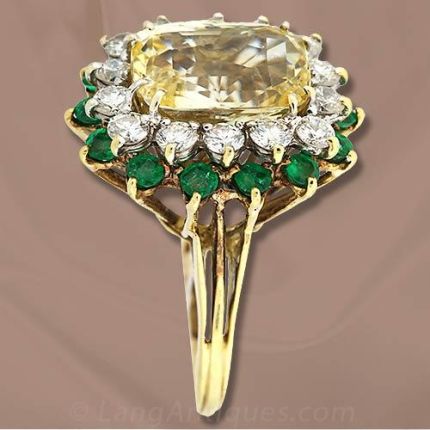 We call this our happy hour ring. It makes you feel good just to look at the lovely combination of colors. The ring centers on a 7 carat pastel yellow cushion-cut sapphire surrounded by a row of 14 round brilliant cut diamonds (1.40 carat total, GH color, VS clarity) and outer row of 14 fine-green round-faceted emeralds(.85 carat total) set in an 18K yellow gold mount.